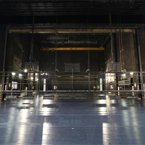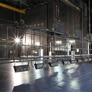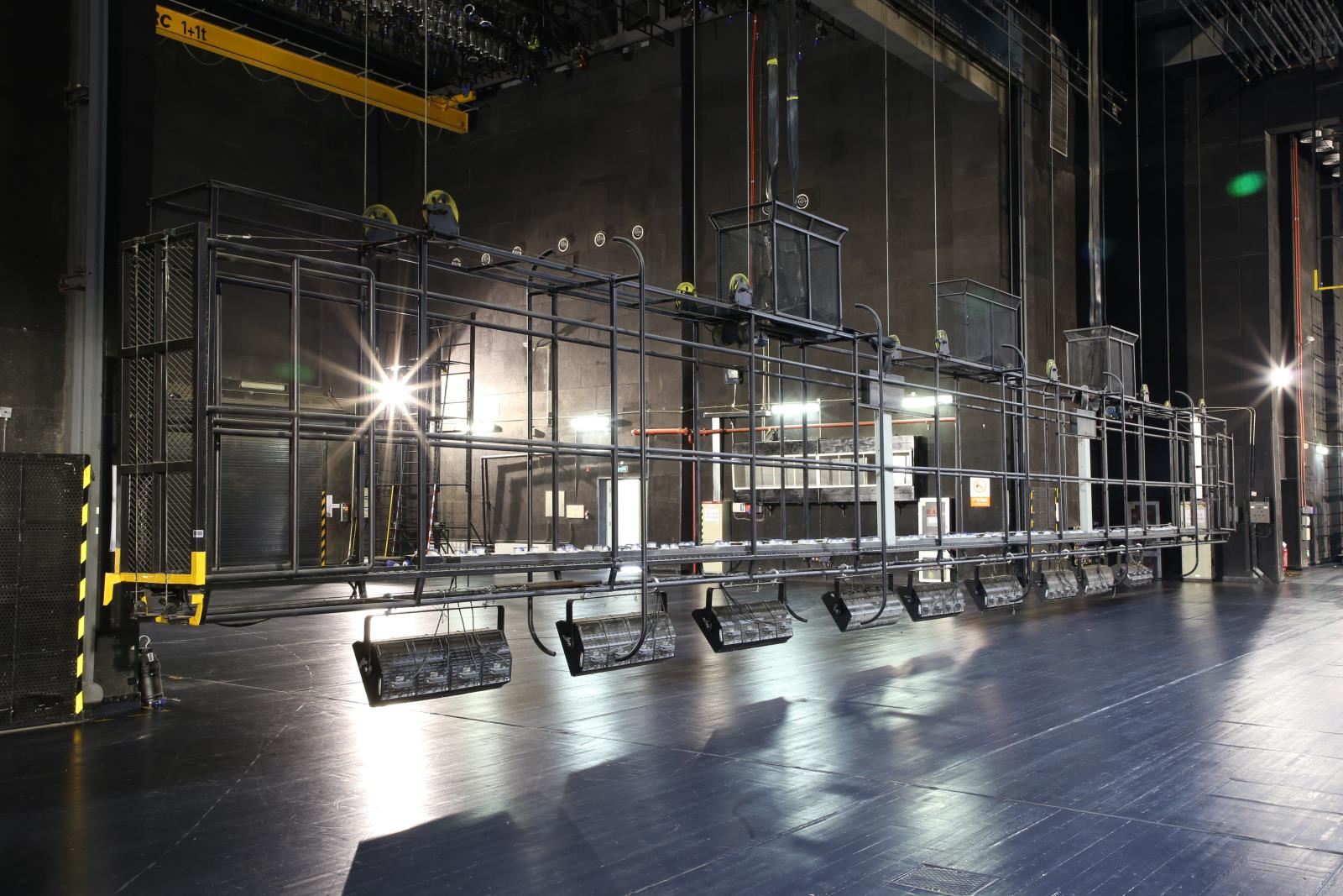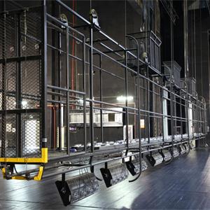 設(shè)置于主舞臺上空,用于吊掛舞臺燈具。現(xiàn)在一般較少設(shè)燈光渡橋,如設(shè),較常設(shè)在主舞臺后區(qū)(即天幕景區(qū))上空。燈光渡橋與一層天橋通過“碼頭”相連,許可2名工作人員進(jìn)入燈光渡橋工作。碼頭形式一般為翻轉(zhuǎn)式,翻轉(zhuǎn)到位后固定于天橋上。燈光渡橋的兩側(cè)設(shè)計便于安裝燈具,設(shè)電纜收納裝置。一層天橋兩側(cè)與“碼頭”對應(yīng)位置各設(shè)一道安全防護(hù)門。天幕燈光渡橋上一般鋪設(shè)5mm厚的鋼板網(wǎng)(QB/T3896-1999)TL=22mm,TB=26mm,鋼板網(wǎng)上鋪設(shè)橡膠地板,型號為天然耐磨膠板,厚度為4mm。